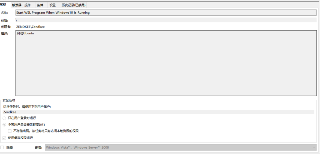 创建基本任务,任务名称随便起,例如:Start WSL Program When Windows10 Is Running , 描述怎么写看心情